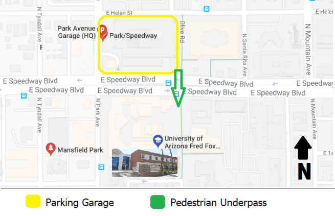 Parking is available in the Park Ave. Garage, located at the corner of Park Ave and Speedway. The garage is free on the weekends, and also offers an underpass so you don’t have to worry about crossing Speedway. The Fred Fox School of Music is up and to the right as you emerge on the southern side of the underpass.