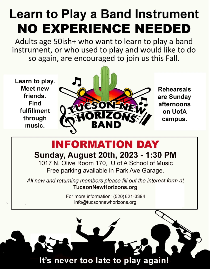 The Tucson New Horizons Band will kick off its Fall 2023 season with rehearsals starting on Sunday, September 10th. Rehearsals will take place at the Fred Fox School of Music on the University of Arizona campus.