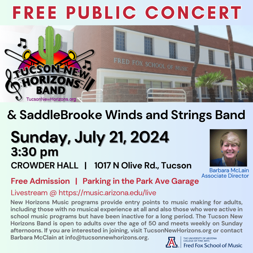 The Tucson New Horizons Band along with the SaddleBrooke Winds & Strings Band invite you to attend our Summer 2024 concert!