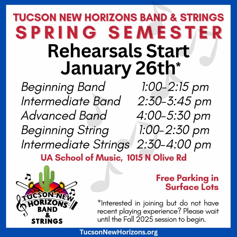 Current members should keep an eye out for an email from Matt or Barbara with details and other pertinent info. If you didn’t play with us this past fall, please send an email to info@tucsonnewhorizons.org to let us know you’re planning to join us for the spring. This will allow for a head count to provide enough music to be printed for all who need it.